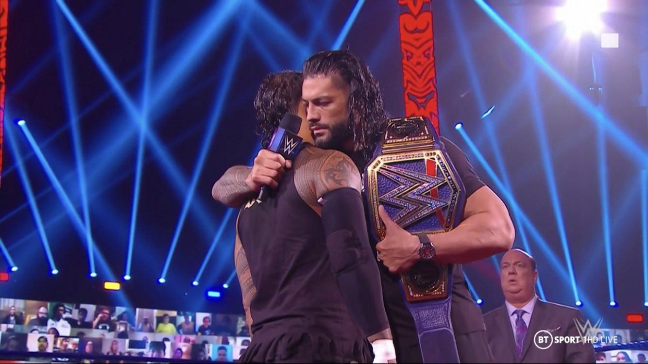 Y cuando empieza a mencionar a algunos miembros de su familia, su padre, su tío. Roman interrumpe y dice que no quiere que lo llamen así, ya que Jey no lo reconoció como tal, sino que fue su hermano Jimmy. Por ello, invita a Jey Uso a que aparezca en el ring, cosa que en efecto sucede.