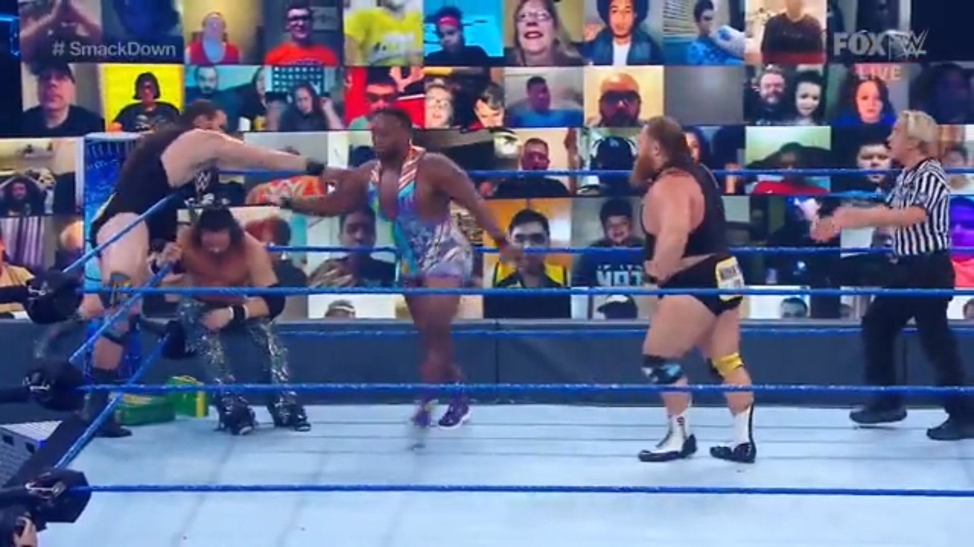 Miz se refugia en el borde del ring y aplica una guillotina a Big E, pero este se recupera y lo derriba, pero Morrison le aplica un doble pisotón. Otis ingresa y sorprende a Morrison y lo arroja encima de Miz. Luego, Otis va por el gusanito, pero falla y Miz le aplica el Skull Crushing Finale, pero Otis se rueda hacia afuera del ring.