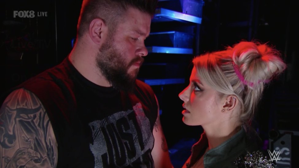 Alexa Bliss y Kevin Owens están tras bastidores y la primera le dice a KO: «Déjalo entrar»