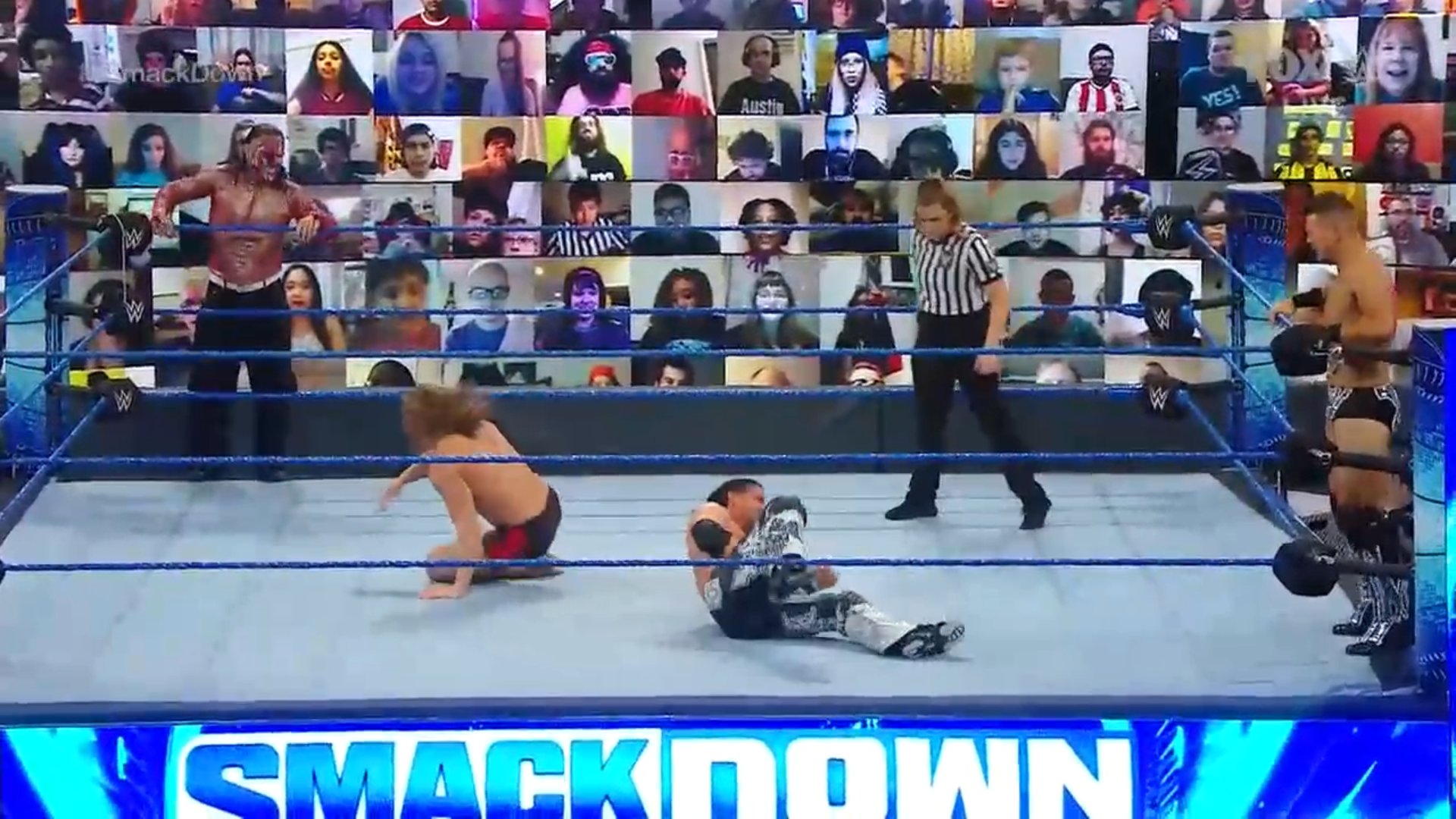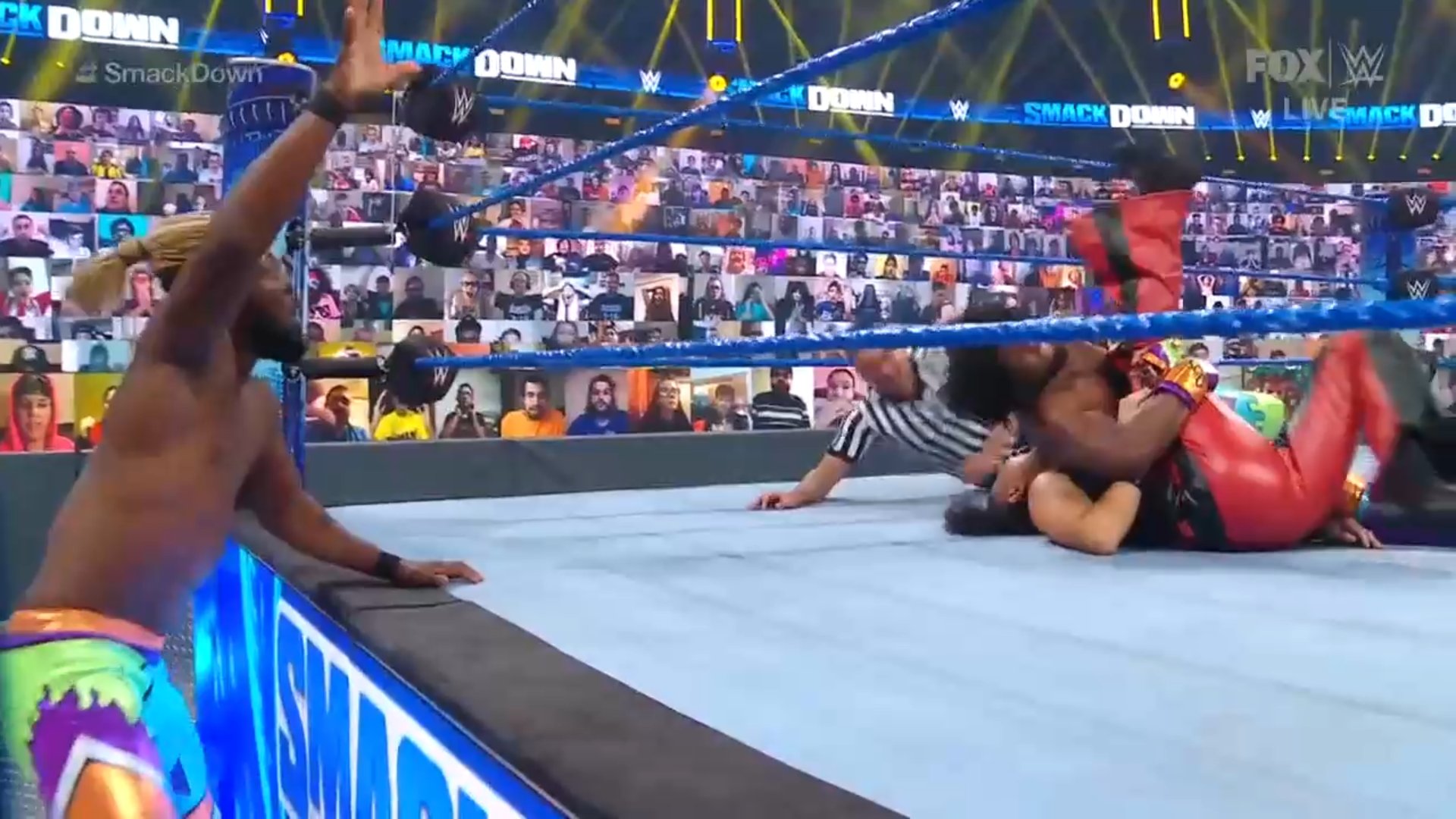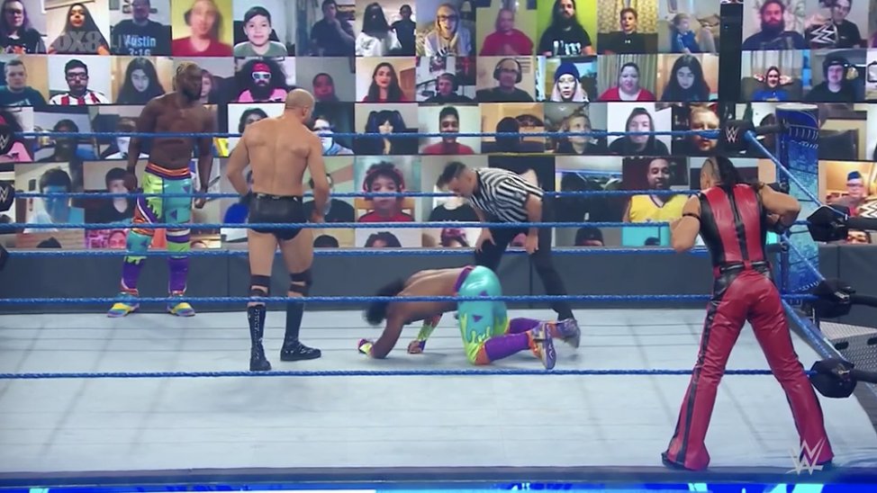 Woods logra recuperarse y lleva a Cesaro a la esquina, donde Kofi toma el relevo y lo cubre por dos segundos tras aplicarle un doble pisotón.