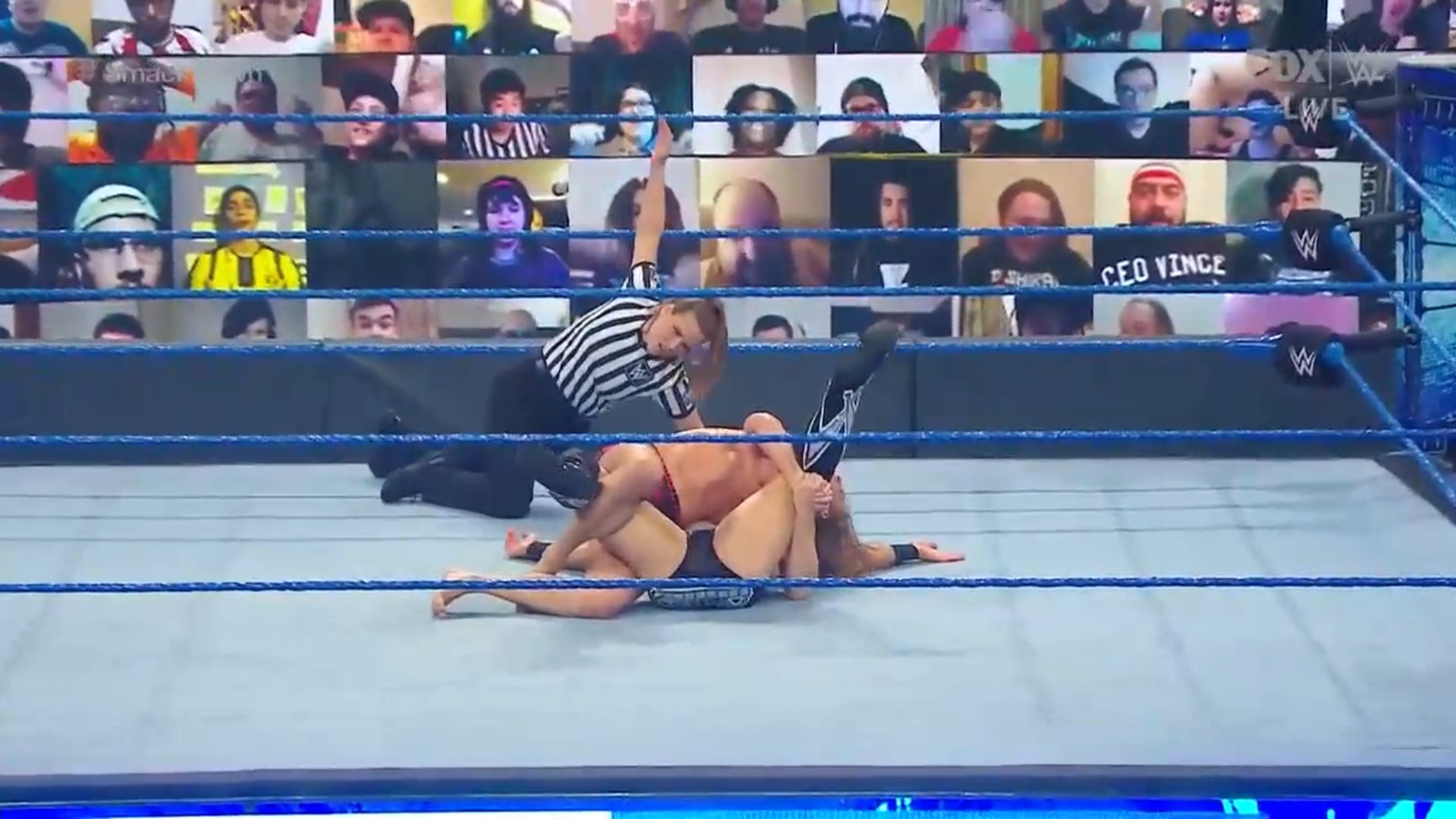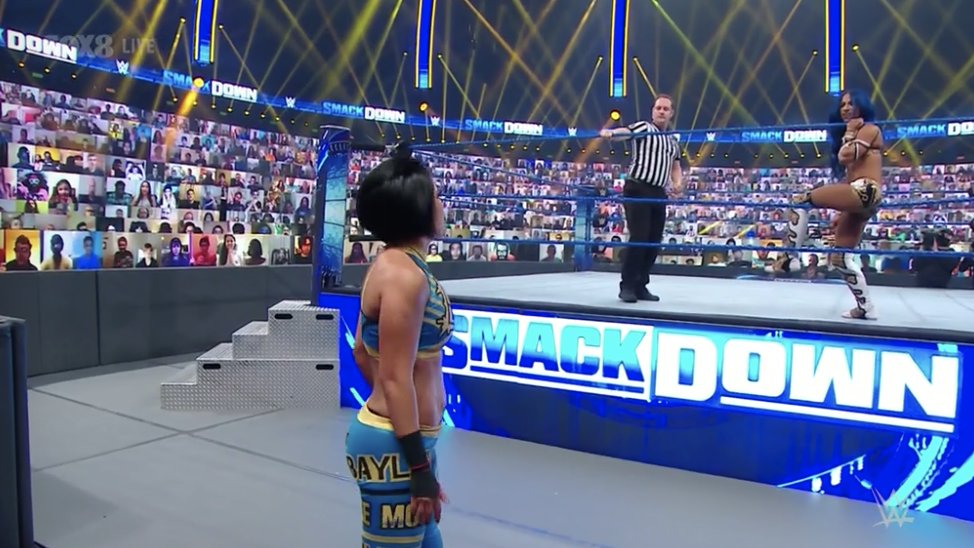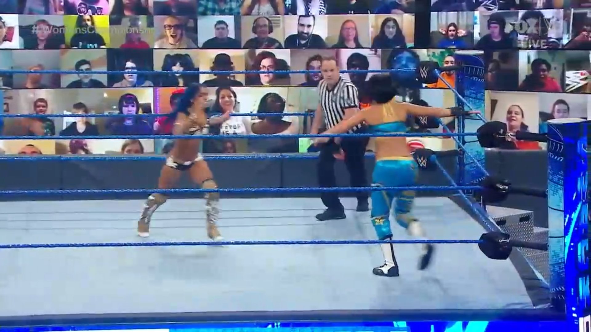 Tras las presentaciones, Sasha Banks ataca a Bayley antes que suene la campana. Bayley se queja y ahora sí, suena la campana.