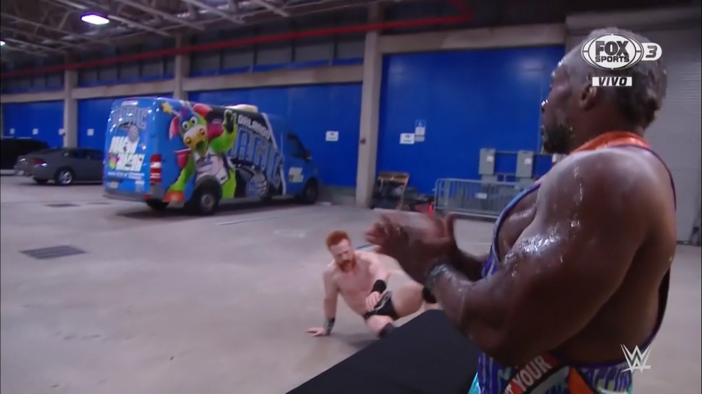 Sheamus sigue castigándole por el pasillo, pero cuando iba a atacar con un monitor, Big E empieza a castigarlo con una escoba, y luego utiliza un tacho de basura como arma.