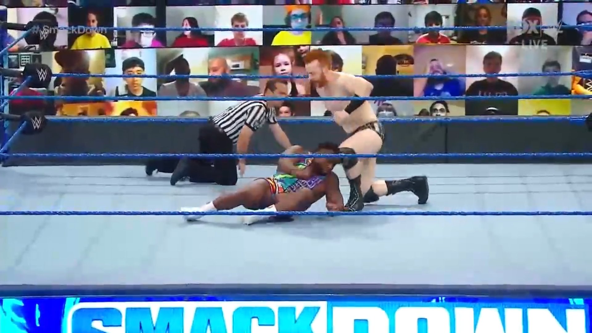 Sheamus busca embestir y recibe un Uranage. Big E se lanza en tope, pero sus piernas quedan un poco atoradas con las cuerdas intermedias, aún así, logra una cuenta de dos.