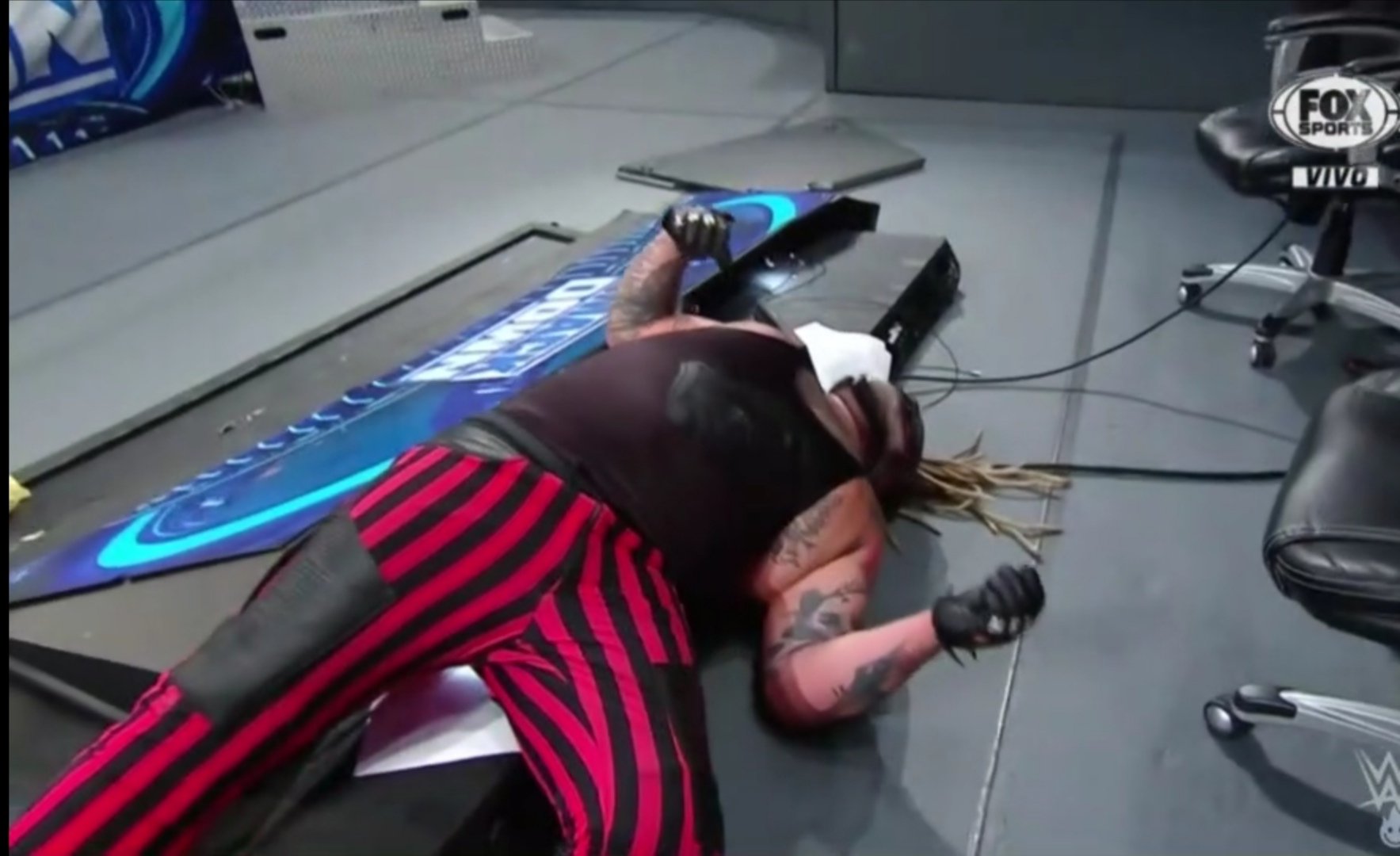 The Fiend intentaba regresar, pero es derribado con una patada y luego, KO se lanza en plancha sobre su rival. Con un par de Powerbombs sobre la mesa, esta se rompe.
