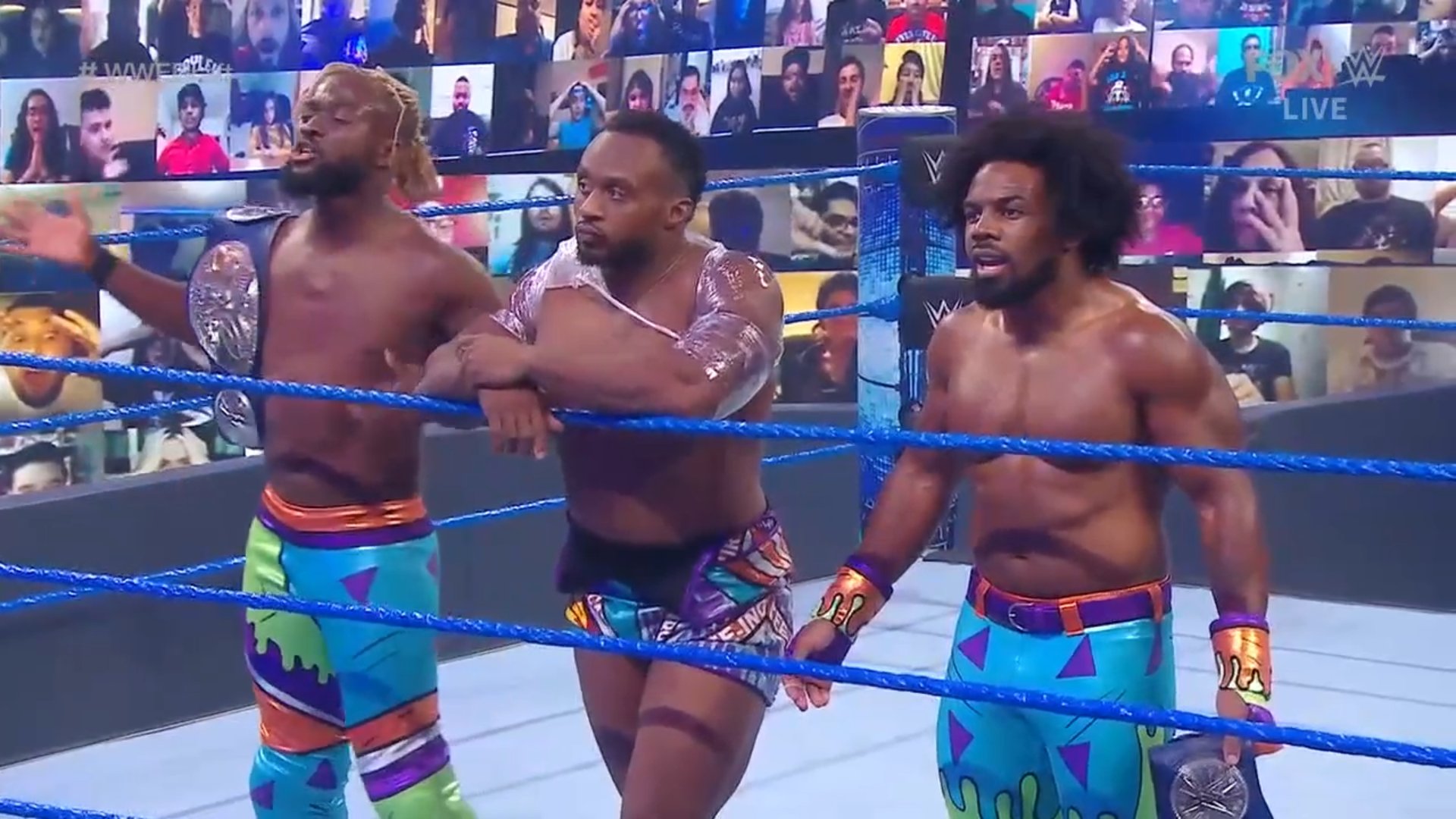 The New Day logra la victoria y son los NUEVOS Campeones de Parejas SmackDown. Noveno reinado para ellos y un retorno auspicioso para Xavier Woods. Big E celebra con sus compañeros.