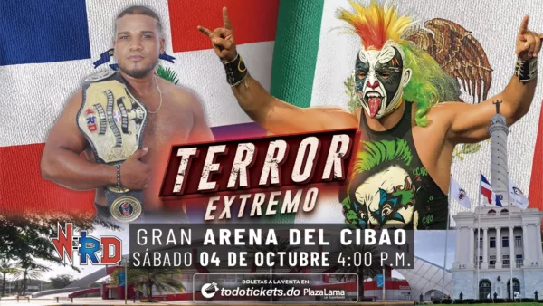 La empresa Wrestling RD presenta el evento Terror Extremo éste Sábado 4 de Octubre 2025 en la Gran Arena del Cibao en Santiago República Dominicana desde las 4:00 de la tarde.