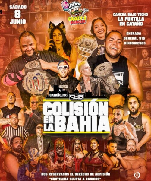 CWA presenta Colisión en la Bahía este próximo Sábado 8 de Junio 2024 en la cancha bajo techo de La Puntilla en el pueblo lanchero, el municipio de Cataño desde las 8:00 de la noche.