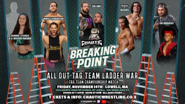 La compañía de lucha libre independiente Chaotic Wrestling presentó su evento Breaking Point 2025, el cual se llevo a cabo el 14 de noviembre 2025, desde Collegiate Charter School Of Lowell en Lowell, Massachusetts, Estados Unidos. El evento fue transmitido por Youtube. Resultados Chaotic Wrestling 28 de agosto 2025 | Owlmania 6 Chaotic Wrestling volvió a