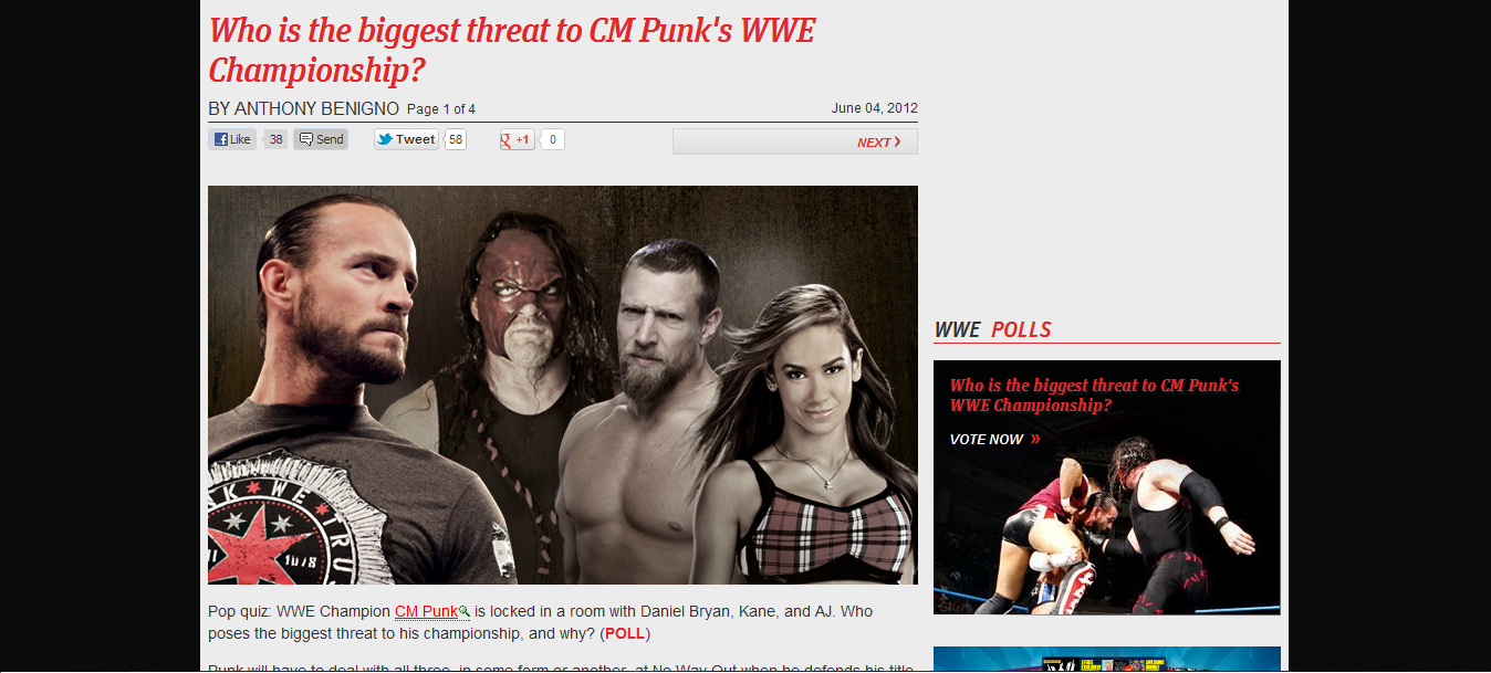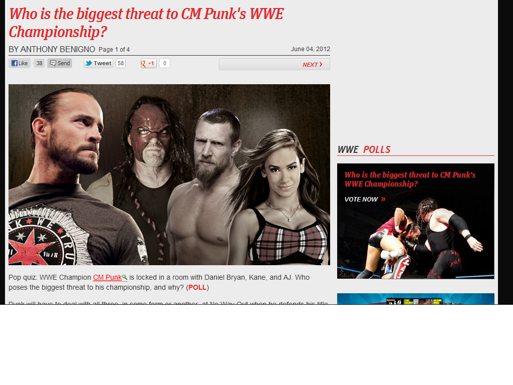 La WWE ha publicado un artículo en su página web oficial acerca de esta cuestión. En el artículo se habla acerca de, por supuesto, los dos rivales del WWE Champion CM Punk en el próximo PPV No Way Out, pero además también nombran a AJ, como una posible amenaza para el campeón.