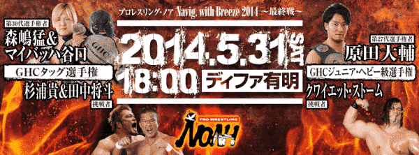 Por Darkangelita. La empresa japonesa Pro Wrestling NOAH dio a conocer el cartel completo para su magno evento del 31 de mayo NOAH «Navigation with Breeze 2014» que se efectuará en el Tokyo Differ Ariake. Como recordarán, en esta función se ponen en juego dos títulos. Además, durante el medio tiempo se presentará el grupo
