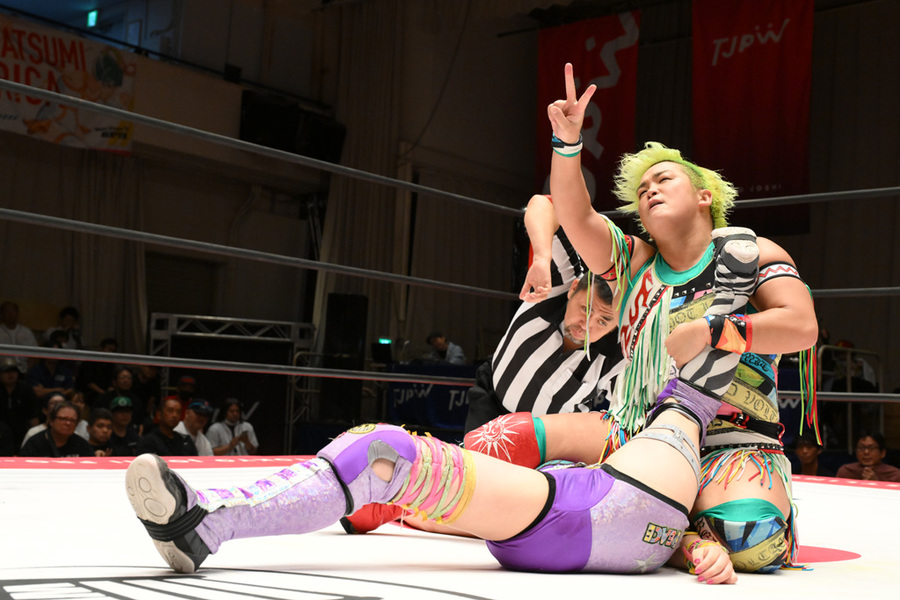1. Wakana Uehara y Haru Kazashiro vencieron a Toga y Uta Takami (9:43) con un Banana Pillow de Uehara sobre Takami.
