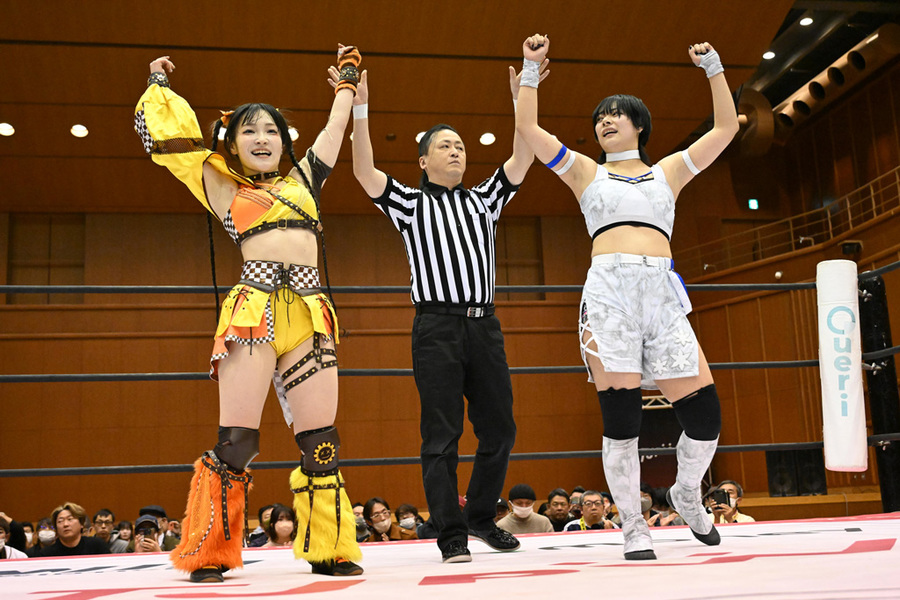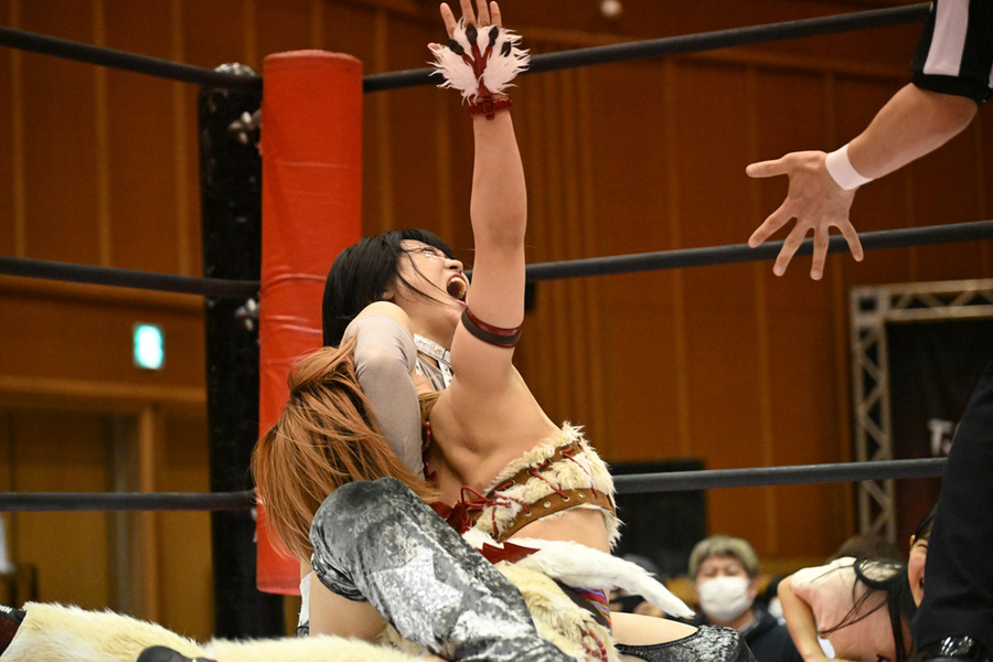 3. Moka Miyamoto y Haru Kazashiro vencieron a Wakana Uehara y Mifu Ashida (10:57) con un Rashomon de Miyamoto sobre Ashida.
