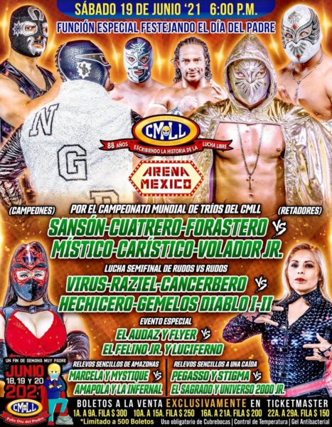El Consejo Mundial de Lucha Libre celebrará con tres funciones en días consecutivos el Día del Padre en la Arena México. Para ese 19 de junio tendrá una función especial, donde en el turno estelar estará en juego el Campeonato Mundial de Tríos del CMLL, donde Sansón, Cuatrero y Forastero se enfrentarán a Volador Jr., Carístico y Místico.
