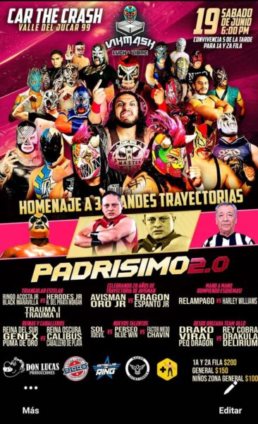 Celebrando el Día del Padre y homenajeando al Halcón Ortiz, Avisman y Rafa el Maya, se presentará el evento Padrísimo 2.0, en el cual estarán varios elementos independientes y que será encabezado por un triangular de parejas donde estarán Ringo Acosta y Black Maravilla; Herodes Jr. y el Hijo del Pirata Morgan; además de los Trauma I y II.