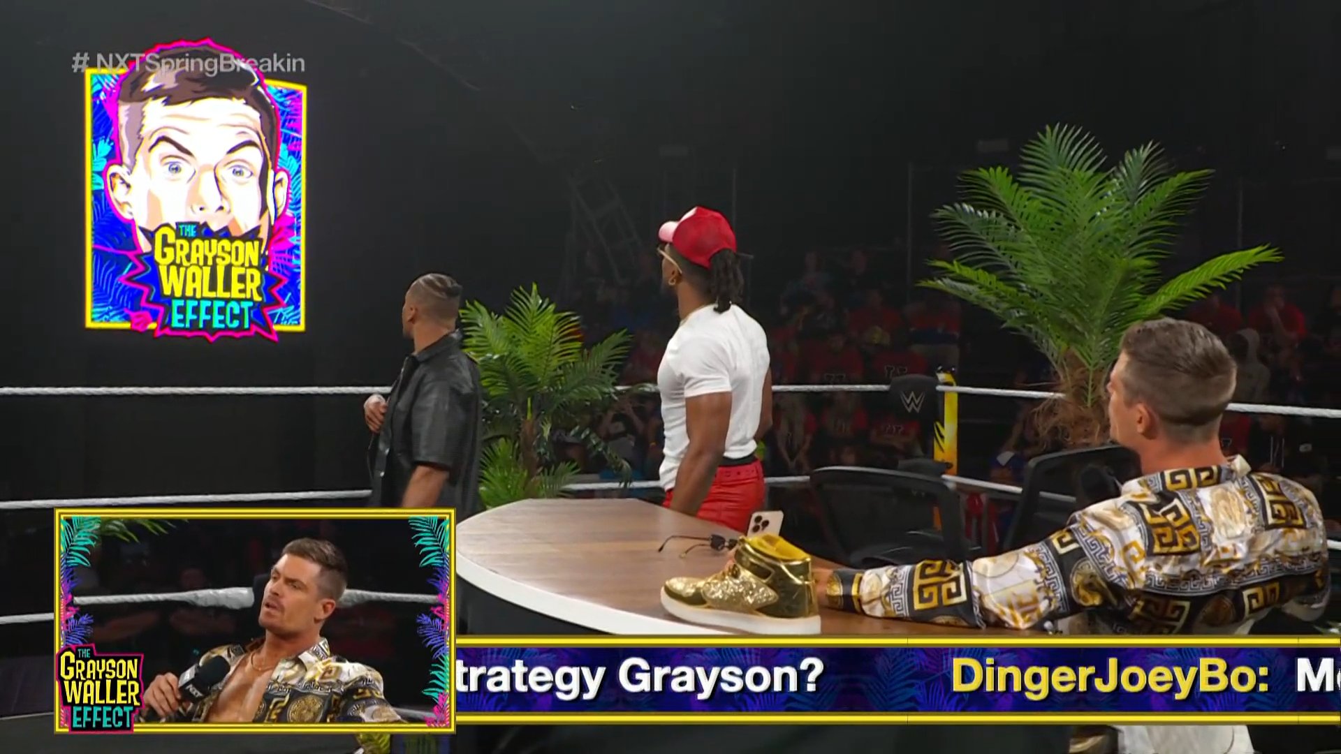Grayson Waller llegó para su segmento Grayson Waller Effect y sin más preámbulo presentó a su invitado Carmelo Hayes, quien llegó con Trick Williams, y a quien Waller le dijo que «era mediocre», refiriéndose al significado de HIM.