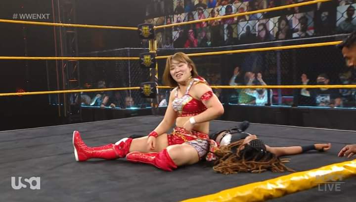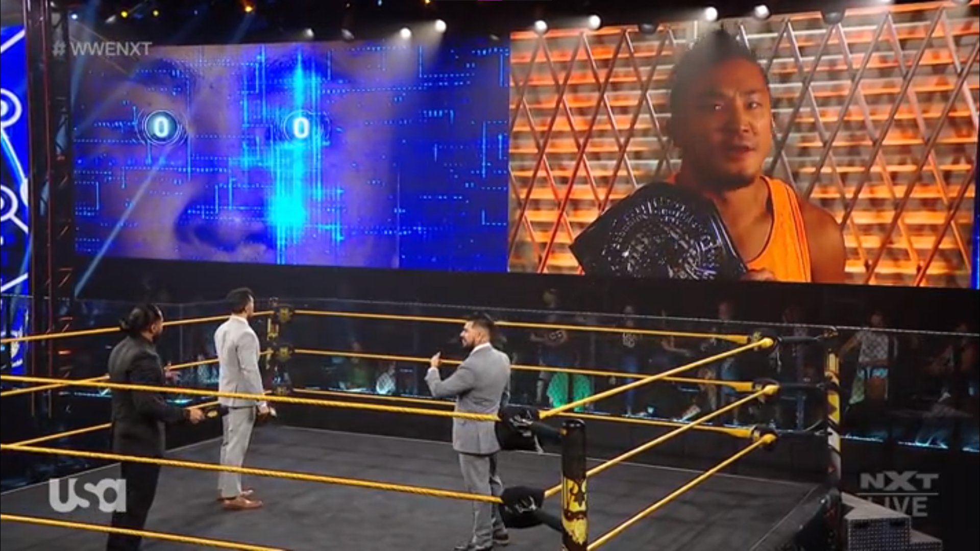 Kushida aparece en la pantalla gigante y le lanza un reto por el Campeonato Crucero NXT para la próxima semana. Escobar acepta.
