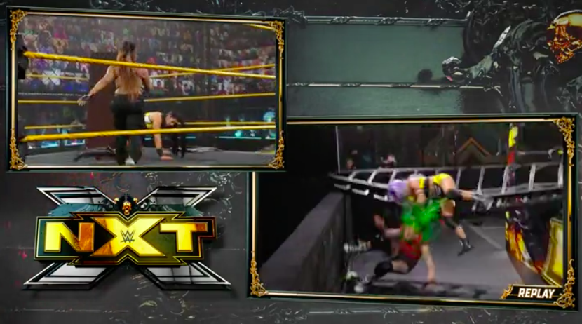 Con LeRae encima de una escalera, Shotzi se lanza con un Senton y ambas caen. La escalera no se rompe así que el impacto debió ser fuerte. En el ring, Moon arroja a Hartwell contra una mesa, pero solo logra una cuenta de dos.