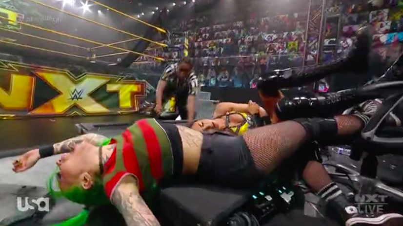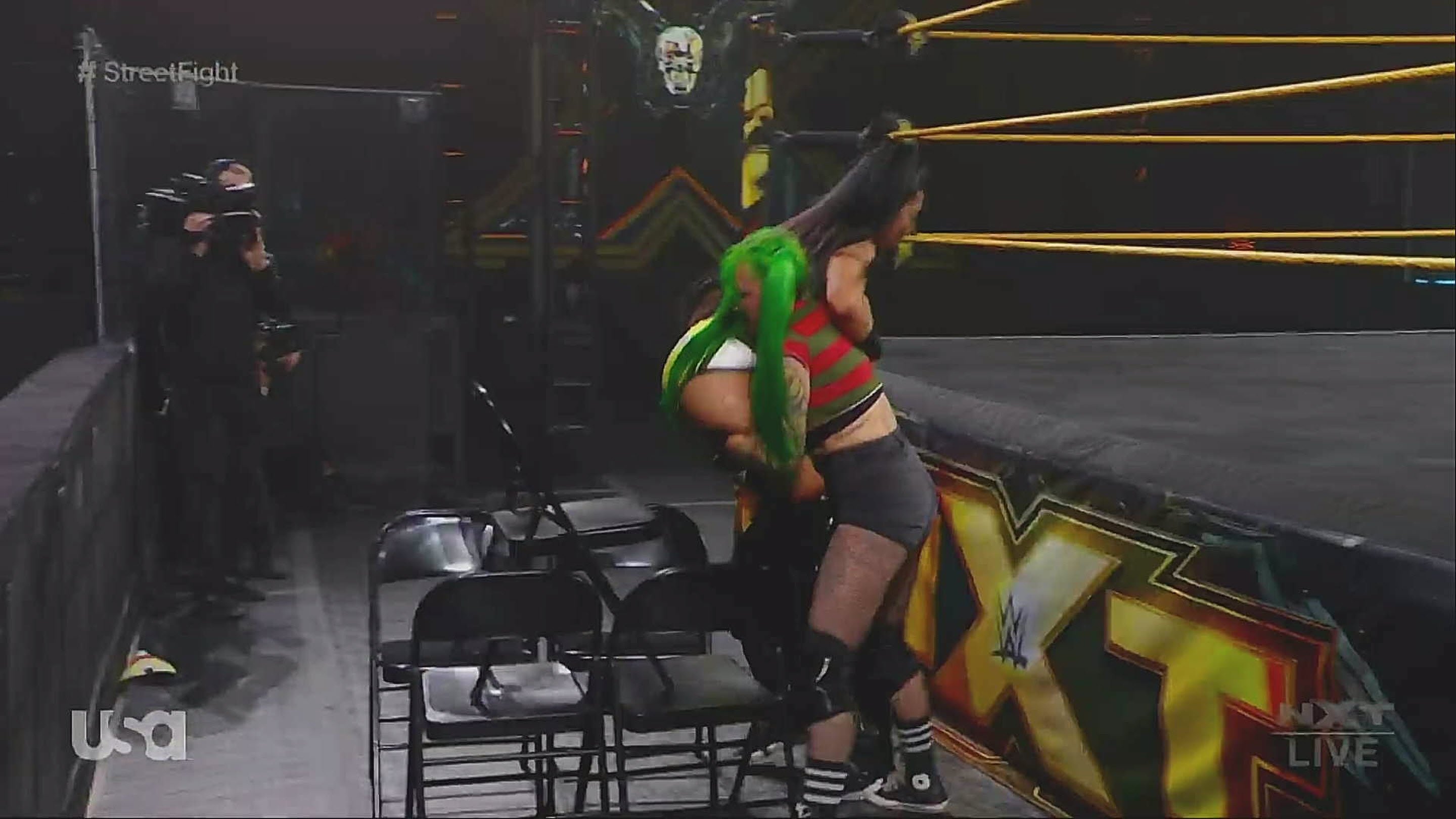 Shotzi intenta sacar una mesa, pero Hartwell la ataca e impide que la arme. En otro costado del ring, Ember Moon derriba momentáneamente a LeRae y empieza a sacar unos botes de basura.