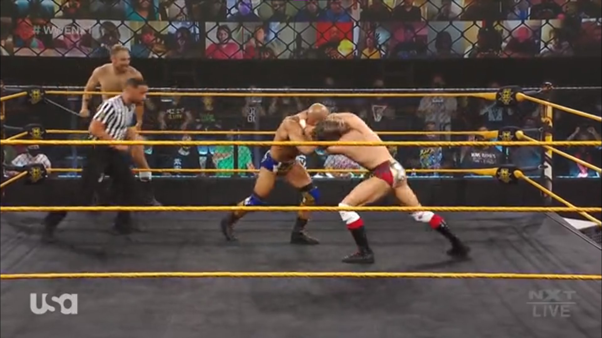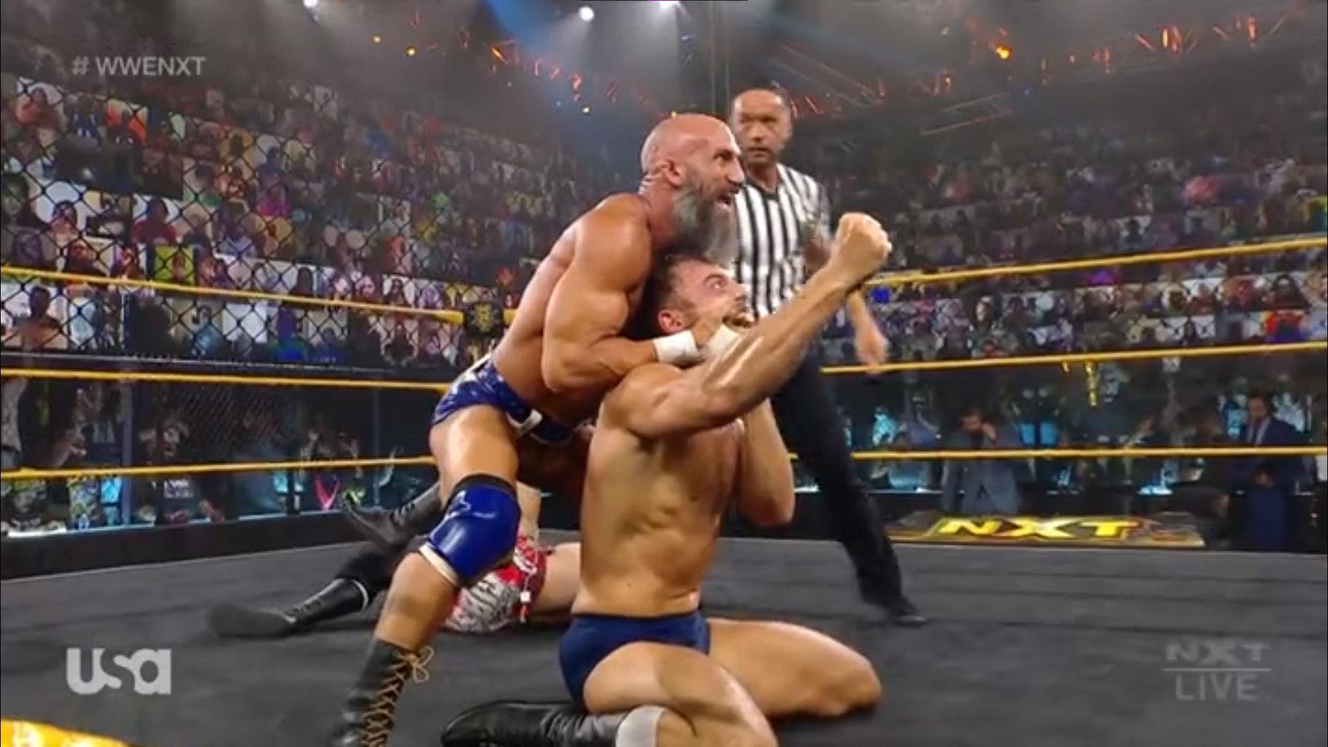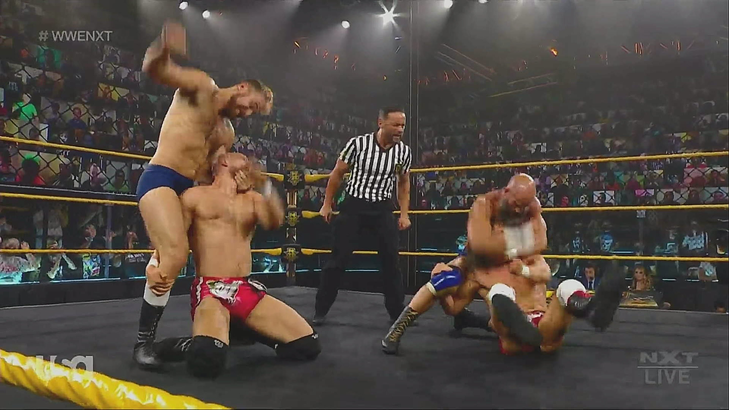 Gargano y Theory intentan sorprender a Kross atacándolo por detrás, y aunque este resiste, rápidamente es dominado por ambos y queda tendido en la lona.