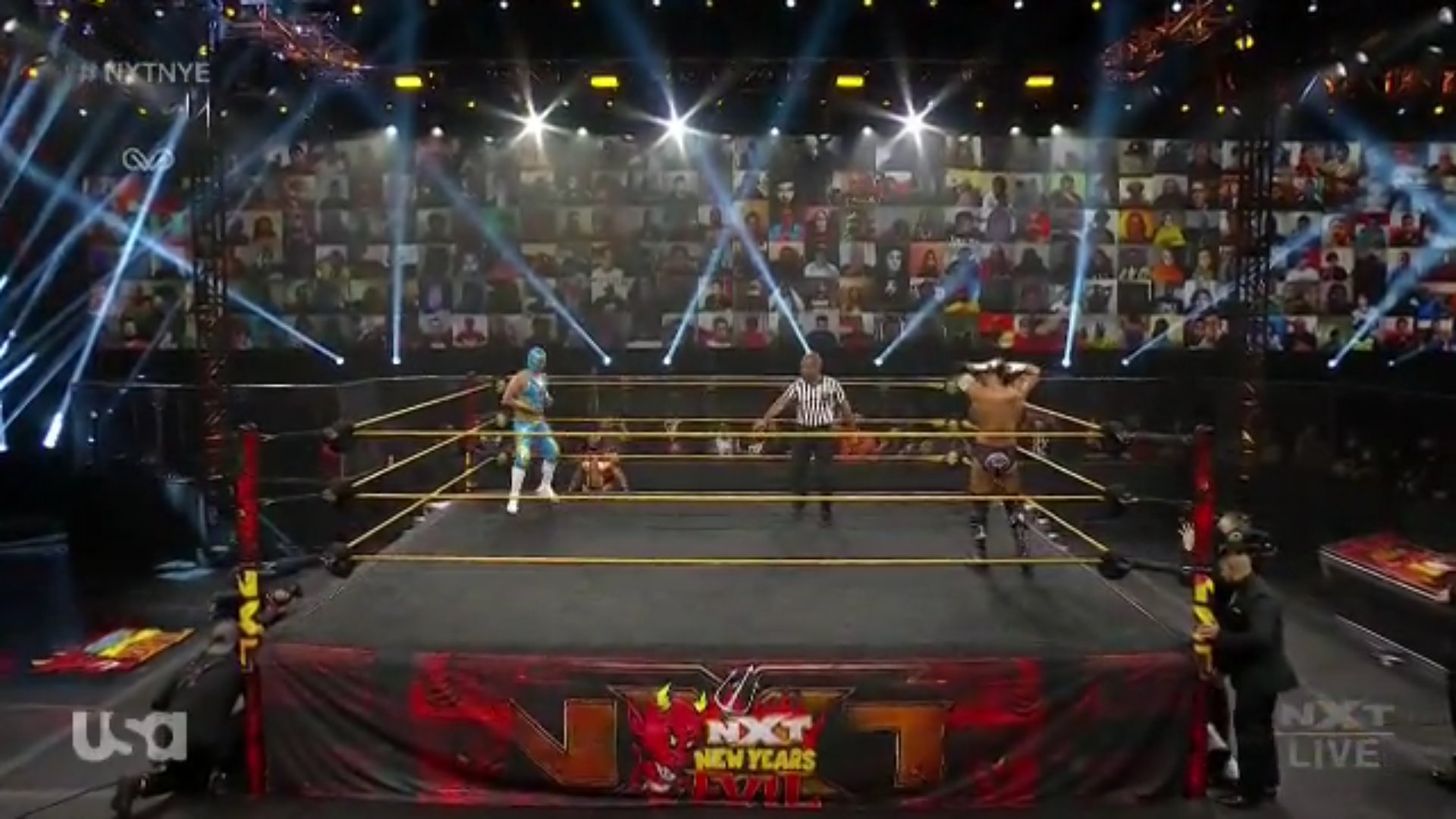 Dexter Lumis, el anfitrión de NXT New Year’s Evil, empieza jugando con las luces, hasta que finalmente da inicio, con el primer combate de la noche.