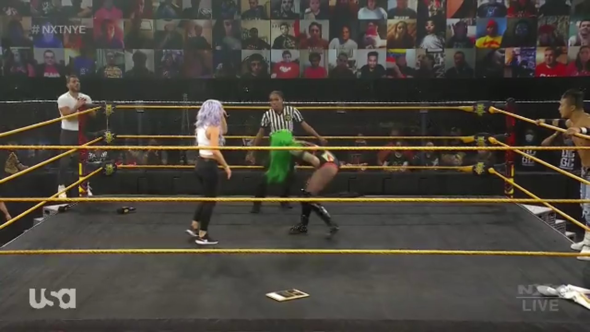 Kushida y Shotzi buscan atacar desde lo alto, pero Theory y Hartwell los mandan para abajo, respectivamente. La réferi advierte a Theory.