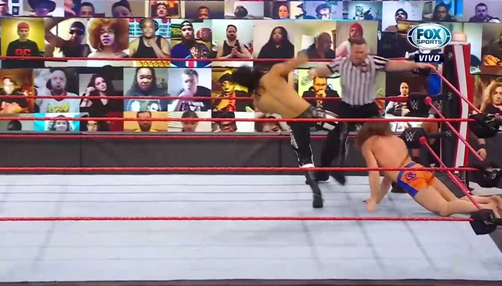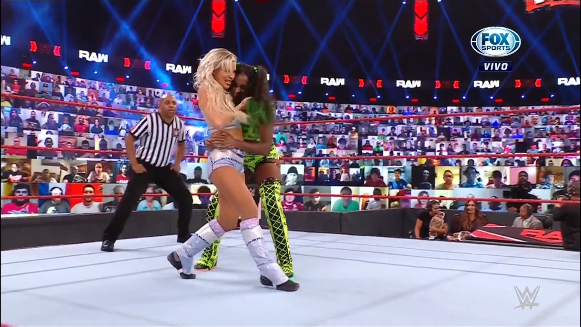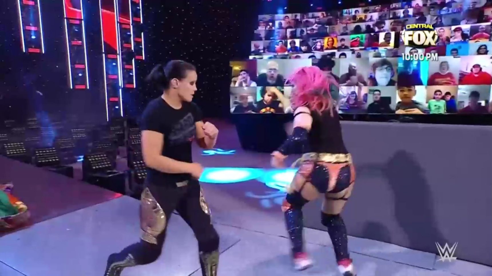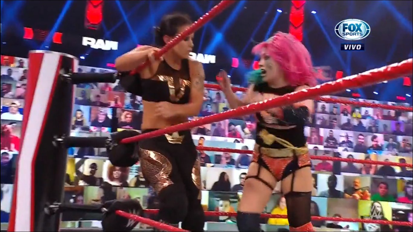 Ahora sí, luego de que lo anterior fuera gratis, Asuka ataca nuevamente a Shayna y remata a Nia Jax con un Hip Attack, pero falla el mismo ataque contra Shayna, quien le conecta un rodillazo en la cara.