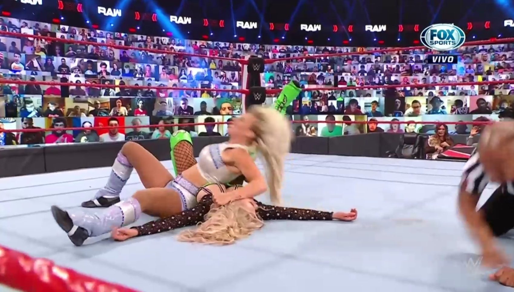Shayna no está contenta con la situación y busca castigar a Asuka con un puntapié, pero Asuka lo bloquea y eventualmente la estrella de cara contra el esquinero. Luego, le quita el protector del esquinero y el protector bucal de Shayna para intentar quitarle un diente, pero el réferi impide que esto pase a mayores.