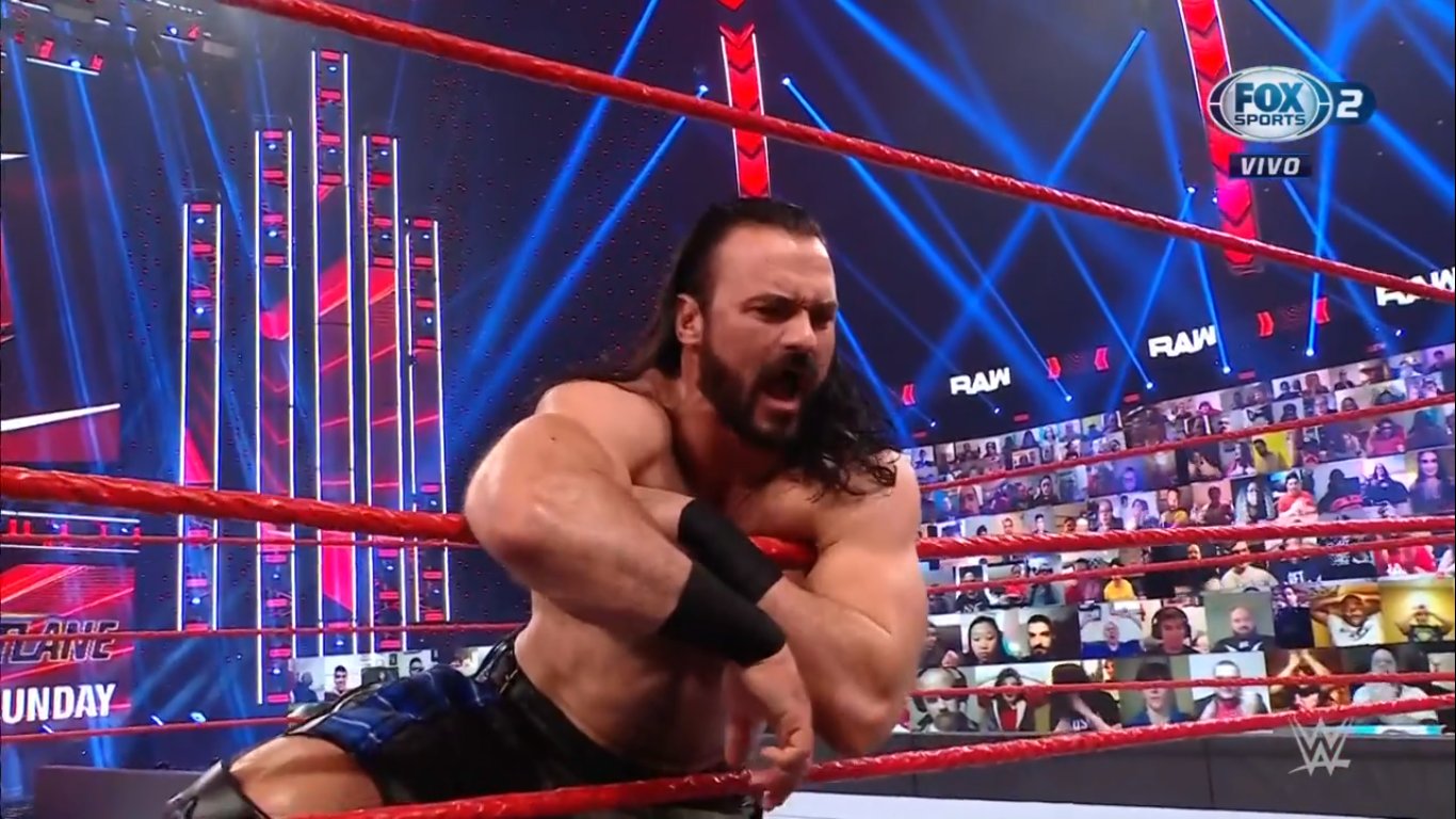 Suena la campana y Miz se lanza contra un Drew McIntyre que estaba siendo atendido segundos antes, pero este revierte la situación y arrincona al ex campeón.
