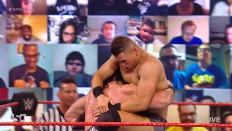 McIntyre sigue en control y vuelve a derribar a Miz con un Glasgow Kiss antes de infundirle más castigo, apoyándose en las cuerdas inclusive. The Miz quiere huir, pero McIntyre lo persigue, lo castiga y lo regresa al ring; sin embargo, Morrison lo distrae.
