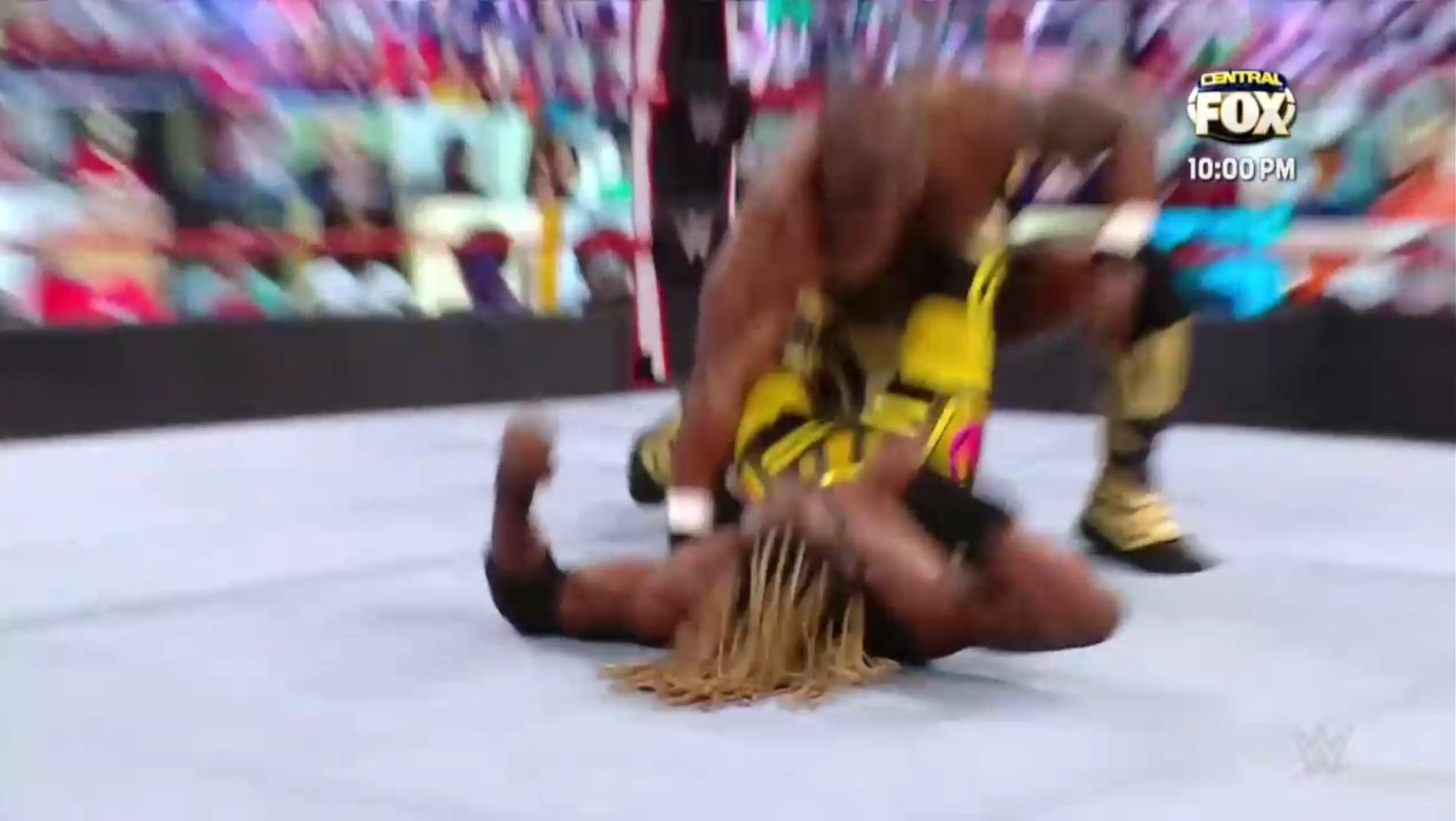 Alexander es sacado del ring y Benjamin es dominado por Kofi. Woods toma el relevo y se lanza con un codazo, mientras Kofi se lanza sobre Alexander sobre un tope. Con una maniobra conjunta, Kofi y Woods se combinan con un Doble pisotón y logran la cuenta de tres sobre Benjamin.
