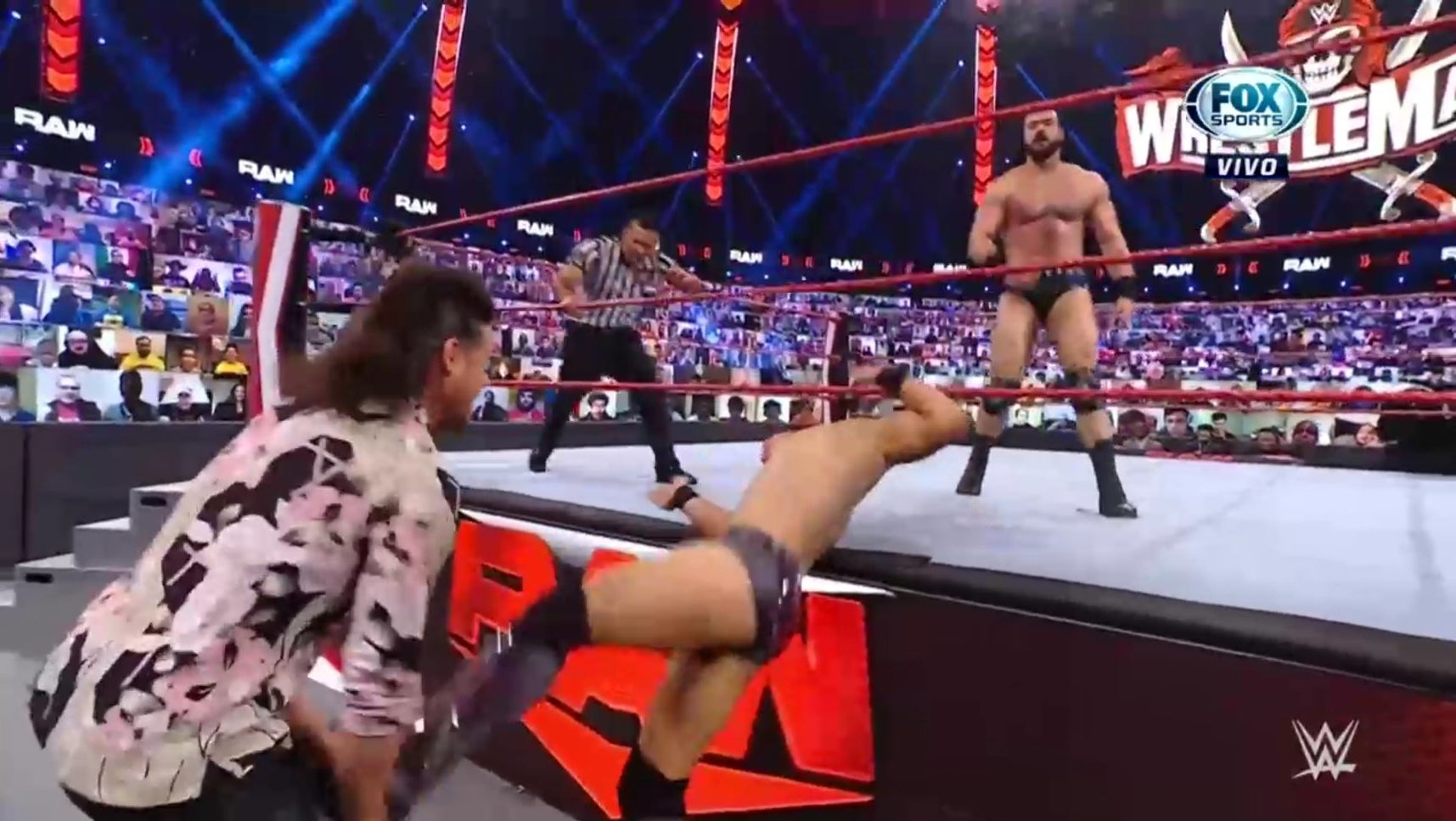 Al volver del corte comercial, McIntyre domina y Miz resiste e intenta el Skull Crushing Finale, pero McIntyre responde con varios lazos y un par de Belly to Belly. Luego, lo saca del ring y lo azota contra el borde del ring y la barrera de protección, antes de estrellarlo contra las escaleras metálicas.