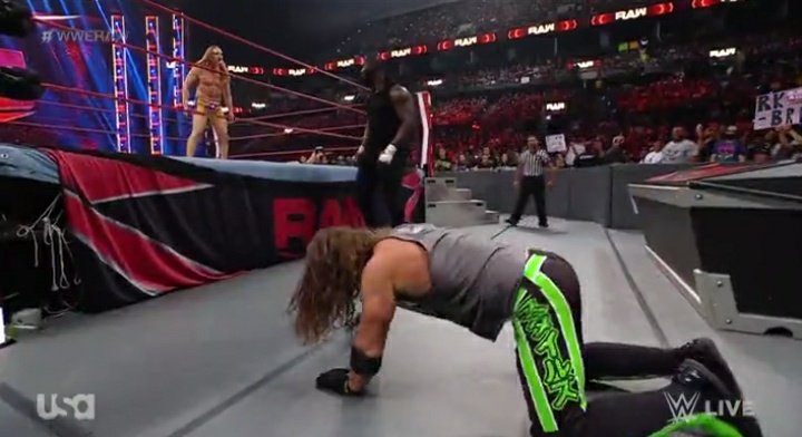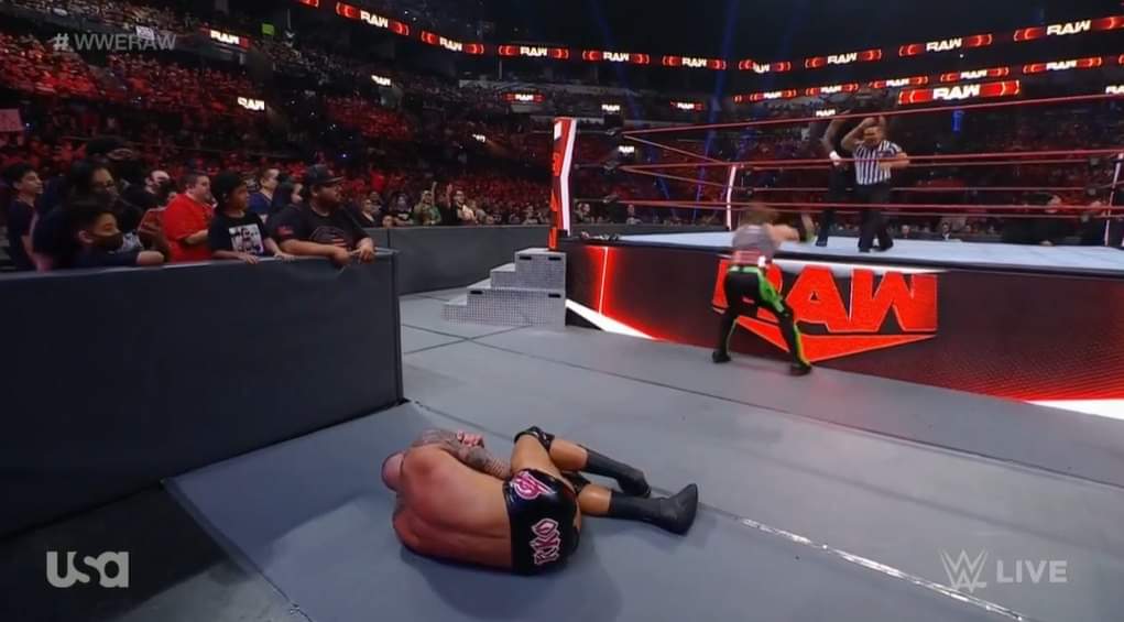 Luego, se refirió a Omos diciendo que es un monstruo, pero que es una mula. Luego, con ayuda del público, dijo que igual lo derrotará con las tres letras más letales del entretenimiento deportivo: R-K-… pero Riddle hizo su aparición antes de que Orton concluyera.