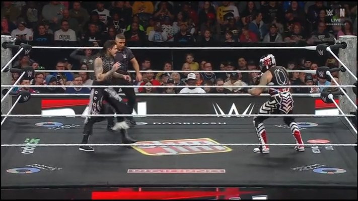 Pearce dijo que Rollins no tenía el alta médica para competir, y aparecieron varios encapuchados para sorprenderlos, con los miembros de seguridad, Theory y Logan yendo en su persecución. Aparecieron dos más, y uno de ellos sí fue el propio Rollins, quien le dio un silletazo en la espalda. Acto seguido, le aplicó un pisotón.