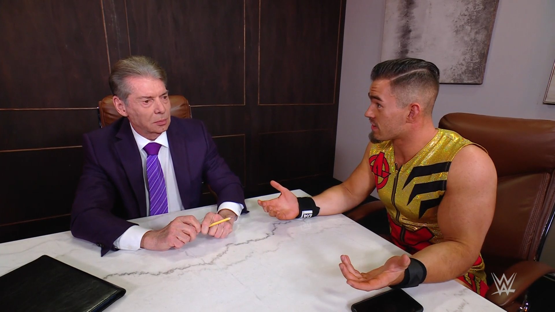 En la oficina de Vince McMahon, el gran jefe y Austin Theory duscutieron sobre la entrevista que tendrá Vince con Pat McAfee y le advierte de lo que podría suceder y le da su respaldo ante cualquier eventualidad.