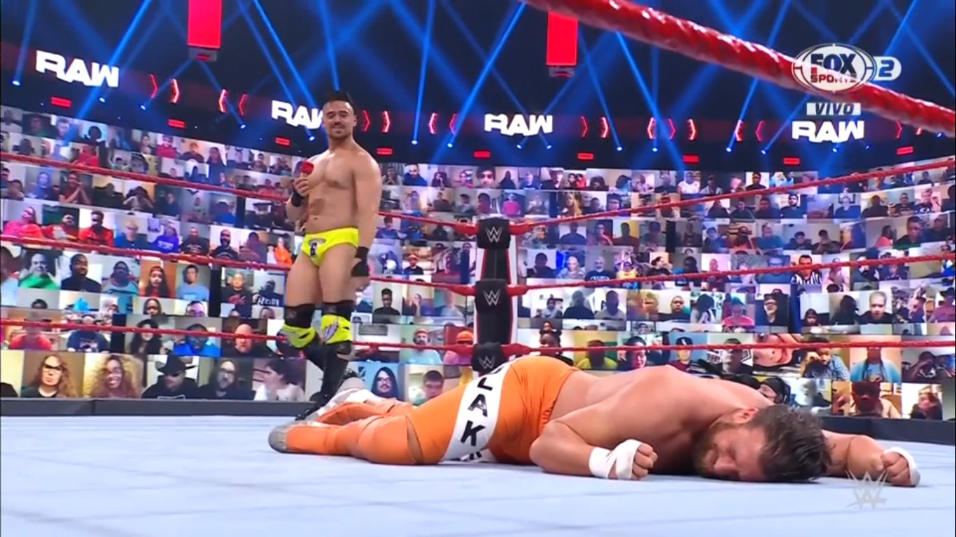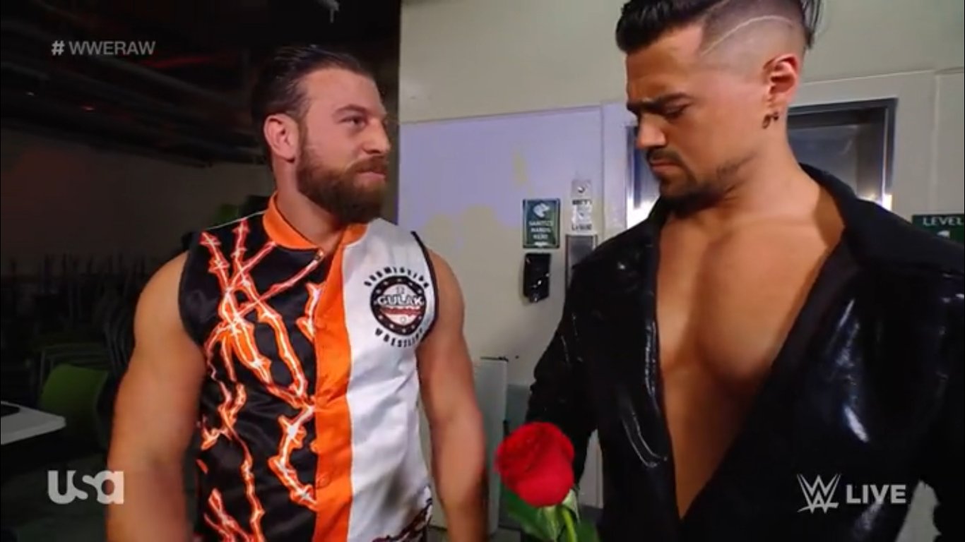 Angel Garza lleva una rosa, y Drew Gulak se burla de él y le lanza un reto. Garza acepta y le dice lo que hará con la rosa una vez que lo derrote.