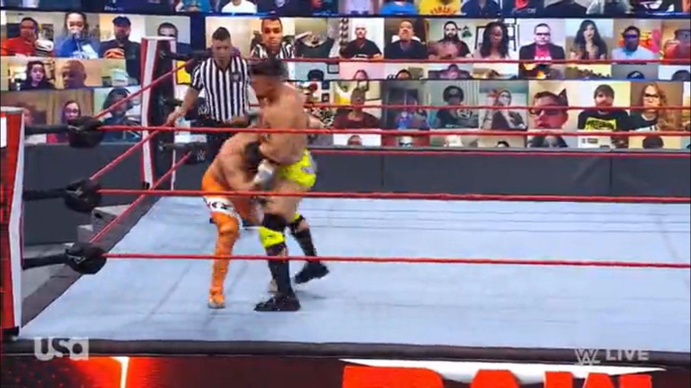 Gulak finalmente reacciona y aplica un candado a la cabeza, pero el mexicano se libera, conecta un lazo y vuelve a atacar arrinconando a su rival contra la esquina. Liquida con el Wing Clipper y cuenta de tres.