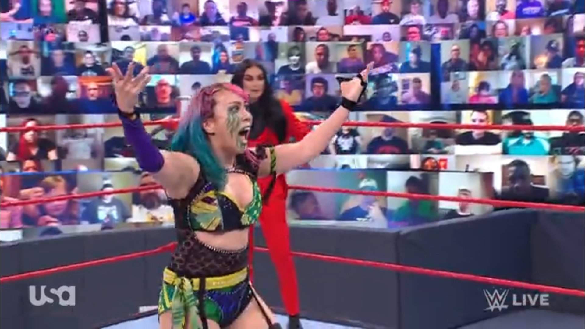 Asuka aparece y se burla de Charlotte Flair diciéndole que es una llorona. Pero no importa, porque las derrotará a ambas y se convertirá nuevamente en Campeona.