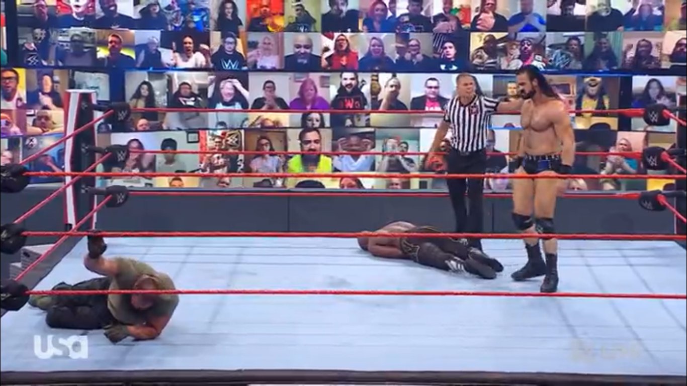 Drew McIntyre es entrevistado y, tras decir que «Mace y T-Bar se quitaron sus máscaras pero conservaron sus estúpidos nombres», dice que se encargará de Strowman y Lashley en WrestleMania Backlash y recuperará el Campeonato WWE. Strowman lo encara y dice que él se ganó bien su oportunidad y en el PPV, él será el nuevo Campeón WWE.