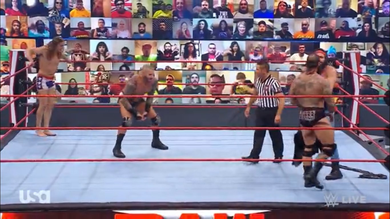 Orton y Elias inician la acción y la víbora ataca con todo. El réferi lo separa y Elias aprovecha para atacar. Ahora es el turno de Ryker, pero una vez más el réferi interrumpe y Orton le aplica un piquete a los ojos.