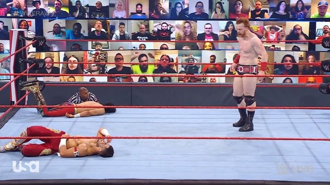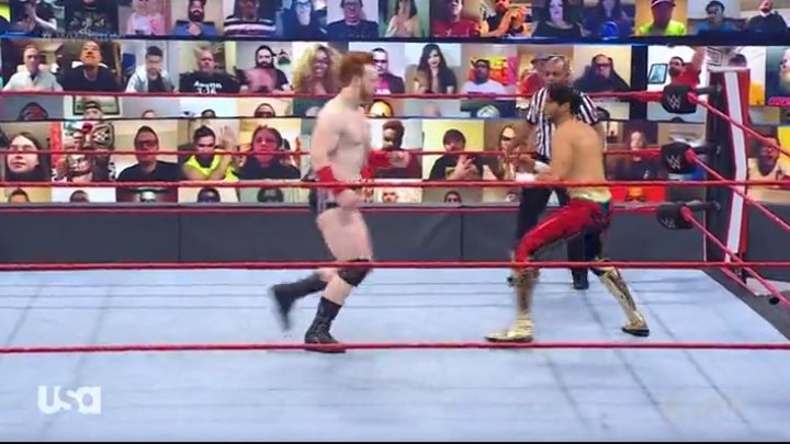 Sheamus saca a Mansoor del ring y este regresa luego de varios segundos, pero es castigado por el irlandés, quien vuelve a sacarlo del ring y lo arroja contra la barrera de protección.