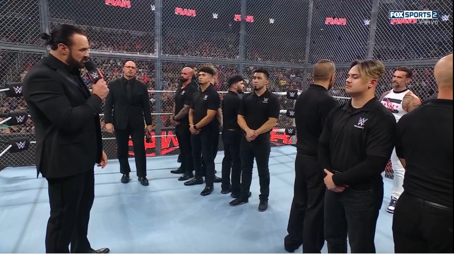 Adam Pearce llegó con un contingente de seguridad para hablar sobre el combate entre CM Punk y Drew McIntyre en Hell in a Cell y dijo que espera que en este último careo entre ambos no pasen de las palabras, por lo que los llamó al ring.