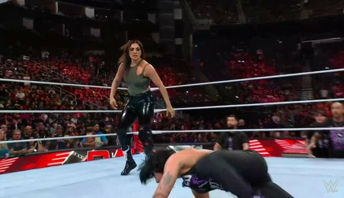 Rhea se refirió a Raquel Rodríguez diciéndole que esperaba que siguiera al margen, pero esta apareció y ambas se fueron a los golpes. Raquel tomó ventaja, castigándola fuera del ring contra las barreras, pero Rhea lo revirtió y enfocó su castigo en la rodilla lastimada.