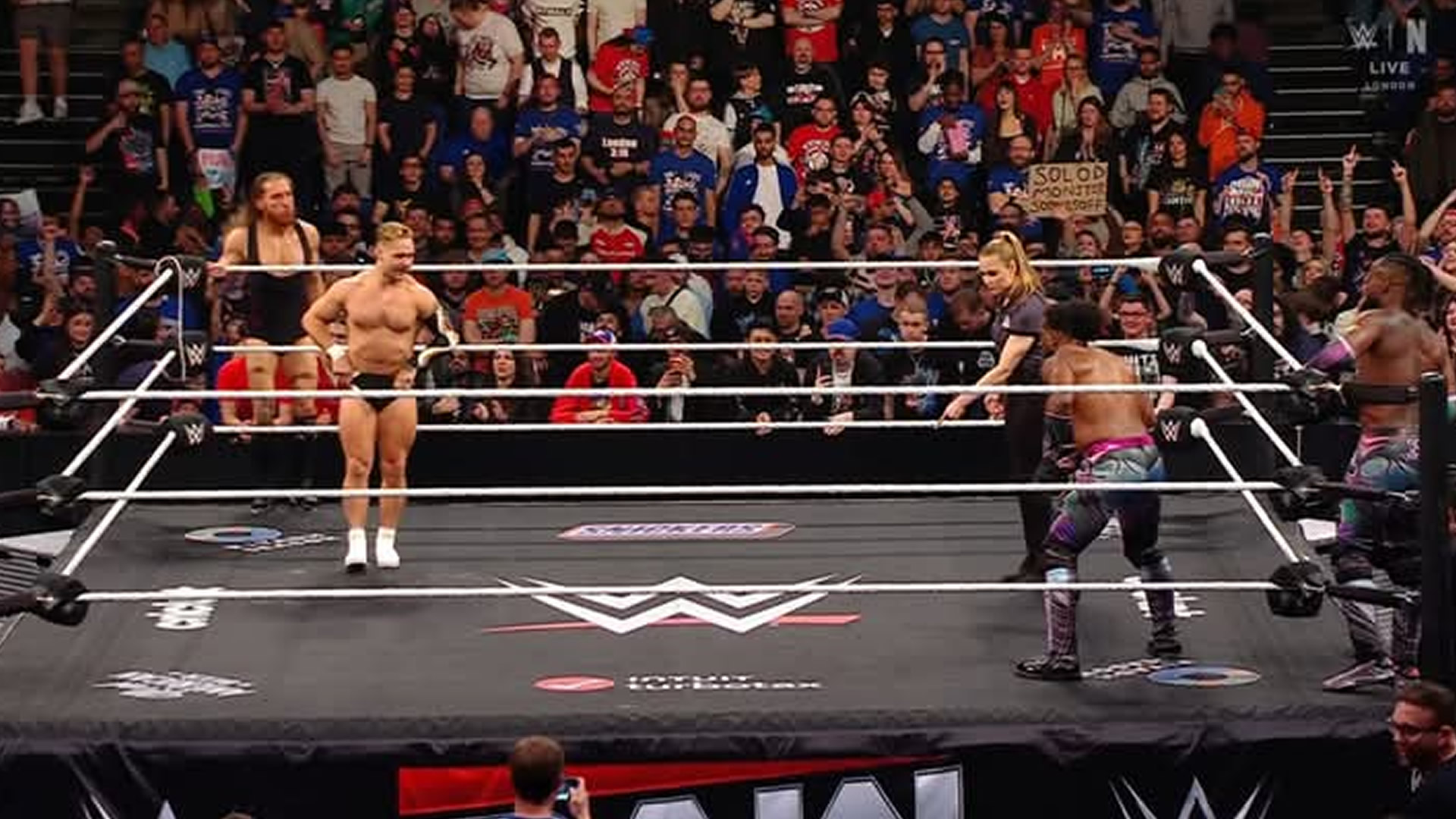 ► Kofi reclamó que habían viajado desde Estados Unidos, dejando atrás a sus familias, solo para ser abucheados por la gente a la que vinieron a entretener. Woods siguió el ataque, indignado porque Adam Pearce los obligaba a ganarse una oportunidad por los títulos en lugar de dársela directamente.