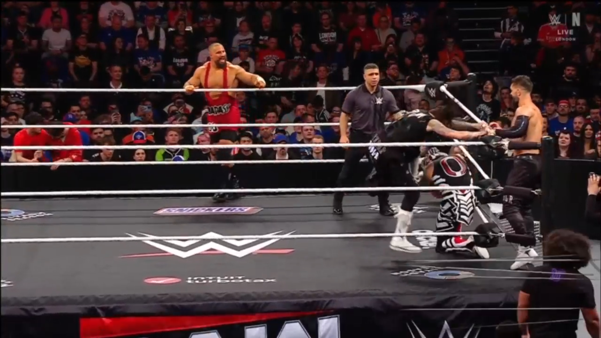 ► Jey regresó al ring para chequear a su hermano Jimmy, quien luchaba por ponerse en pie, mientras el réferi lo atendía. El personal médico llegó rápidamente para asistir a Jimmy, quien aún estaba aturdido tras la paliza recibida.