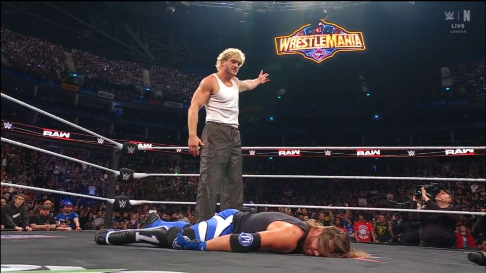 ► AJ lo persiguió y lo estrelló contra la mesa de comentarios. Luego lo lanzó de regreso al cuadrilátero y subió tras él, pero Logan agarró las cuerdas y las jaló hacia arriba, golpeando a AJ en la entrepierna. Con AJ aturdido, Logan aprovechó y le aplicó un supléx que encadenó de inmediato con un DDT, dejándolo tendido en la lona.