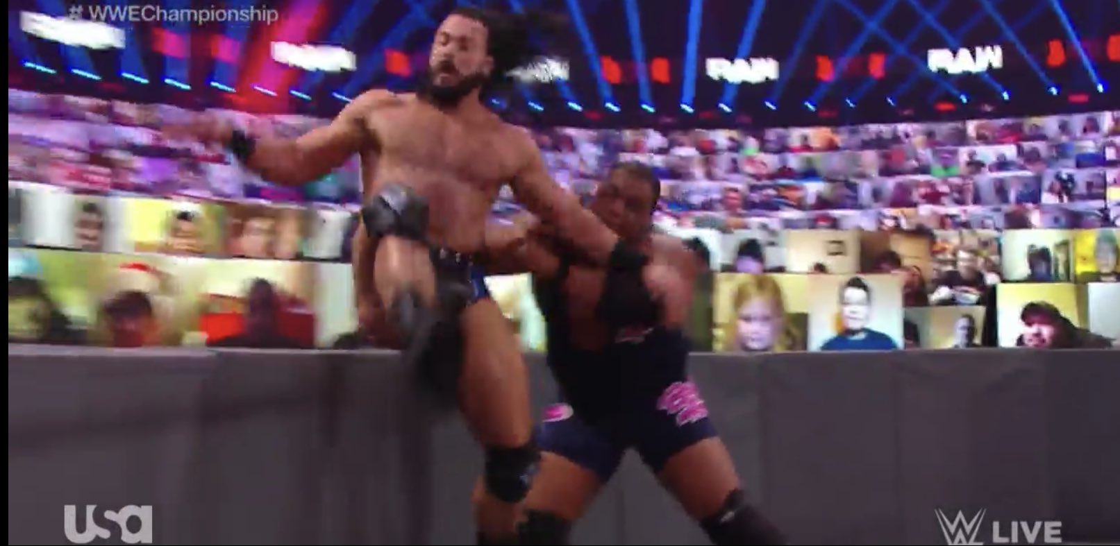 Afuera del ring, McIntyre consigue levantar a Lee y lo arroja contra la mesa de comentaristas con un Powerbomb. Otro corte comercial.