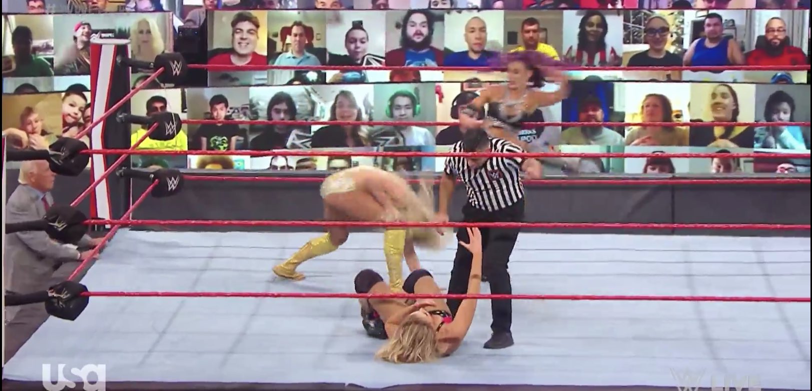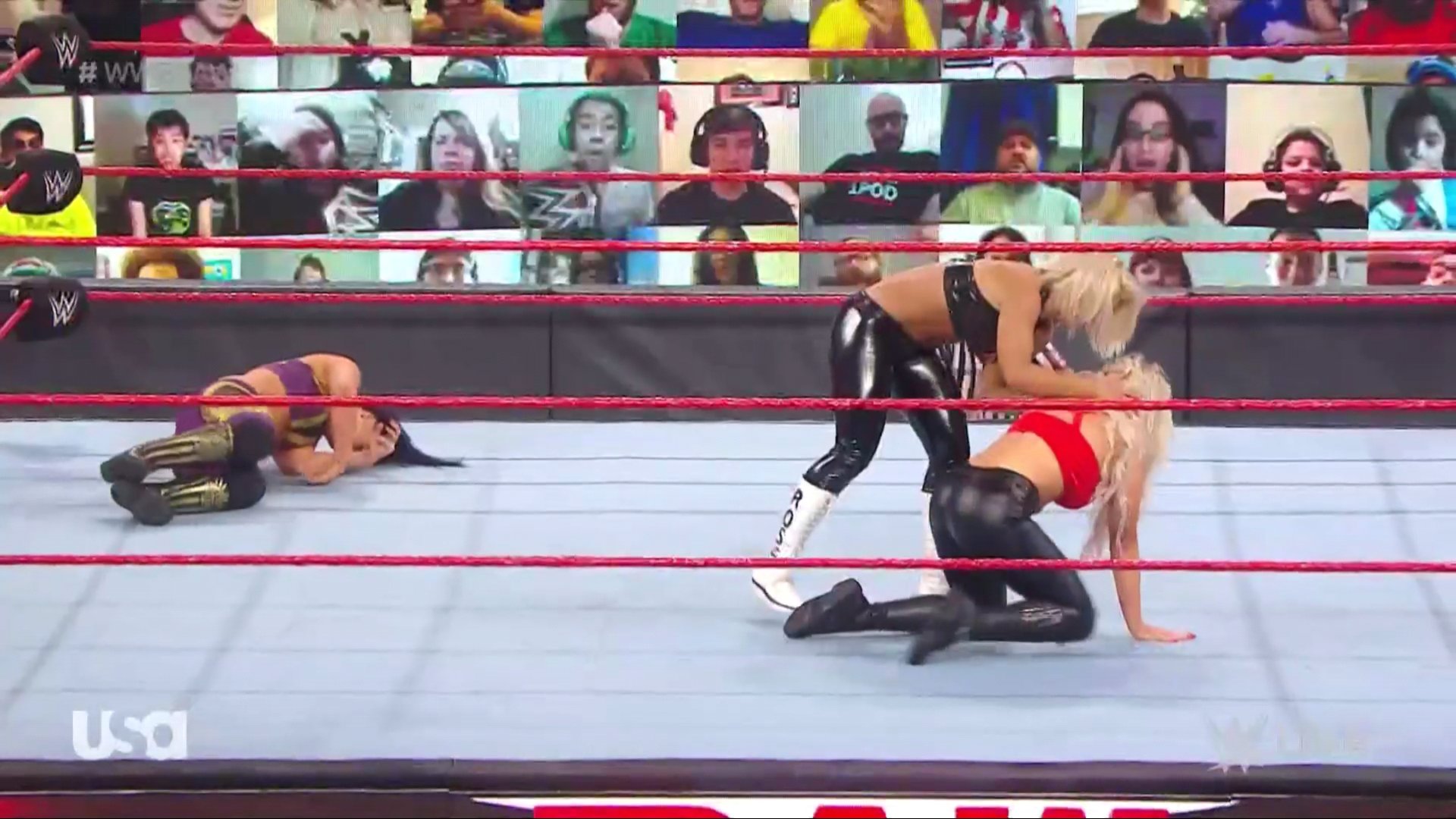 Charlotte va en su búsqueda, pero Royce ya ha tomado el relevo y logra sorprender a La Reina, propinándole varios golpes. Tras un intercambio, Royce provoca a Asuka y esta intentaba entrar, pero el réferi se distrae con ella. Las rudas aprovechan para castigarla en su esquina.