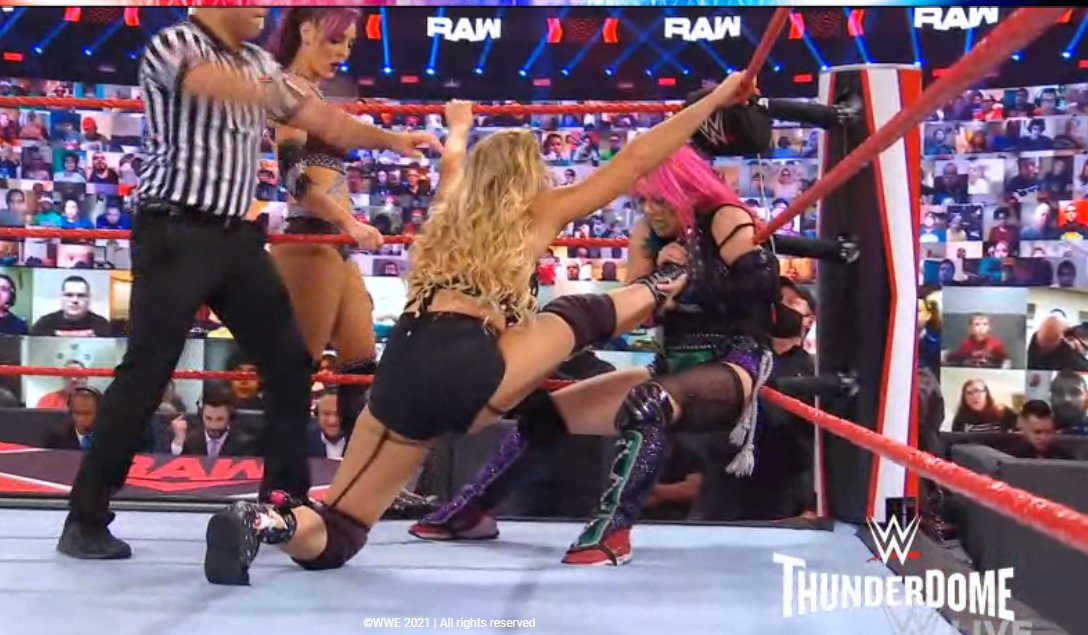 Durante el corte comercial, en imágenes exclusivas del ThunderDome, Evans continúa el castigo a Asuka contra su esquina.