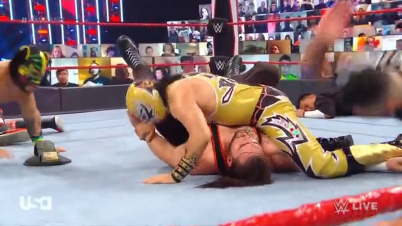 Lince Dorado sorprende a Metalik y consigue la cuenta de tres con enredadera, mientras su compañero luce sorprendido. Segundos después, Truth conecta una patada y logra la cuenta de tres sobre el enmascarado y R-Truth es nuevamente campeón.