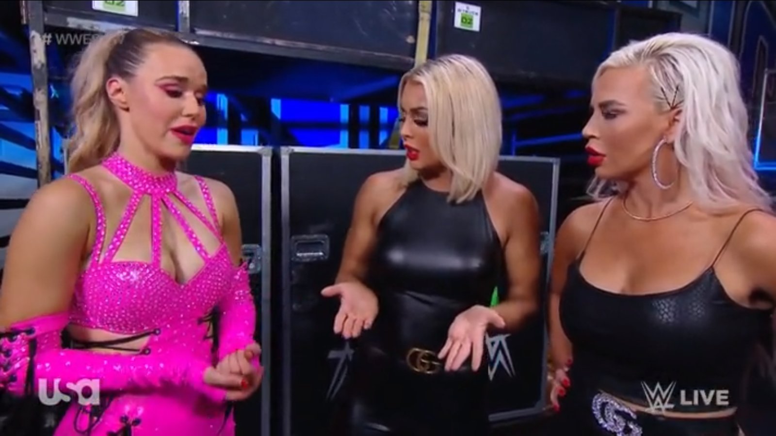 Lana, Mandy Rose y Dana Brooke están afuera del ring.
